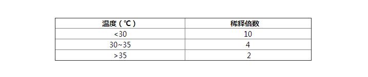 APT-A30应连续投加,建议在计量泵的高频率下进行原液直接投加,也可以用RO产水或除盐水稀释,稀释倍数与温度的关系如下: